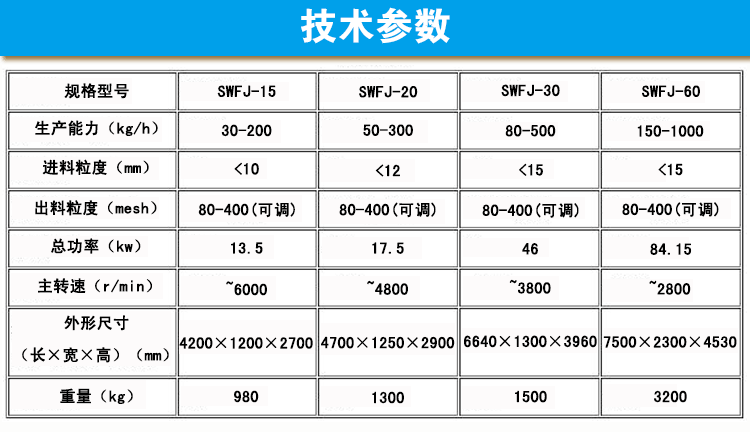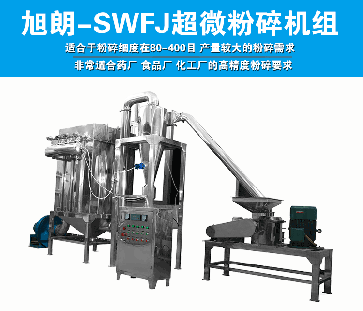 广州米兰体育网页官网_米兰(中国)生产的SWFJ-15/20/30/60型超微粉碎机组主要适合于粉碎细度在80-400目、产量较大的粉碎 需求,非常适合药厂、食品厂、化工厂的高精度粉碎要求,粉碎细度可随意调节。 该粉碎机组主要由主机、辅机、电控箱三个部分组成,设计紧凑,结构合理,属风选式、无筛网。超微粉碎