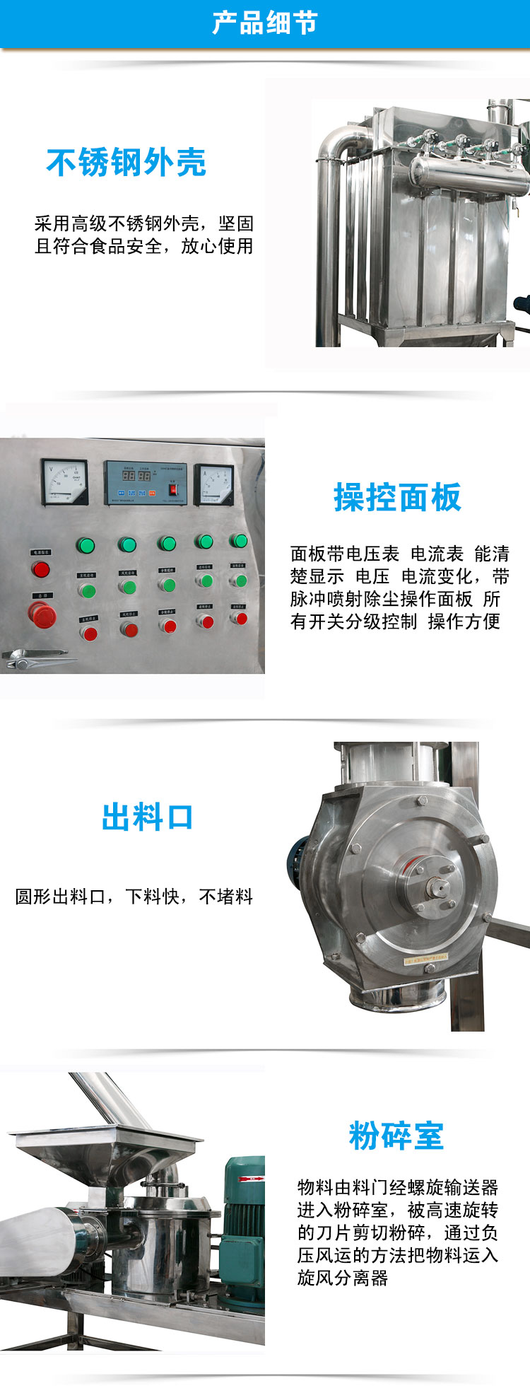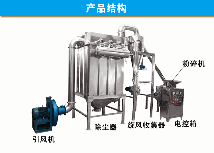 物料由料门经螺旋输送器进入粉碎室,被高速旋转的刀片剪切粉碎,通过负压风运的方法把物料运入旋风分 离器,袋式除尘器、排出物料粉尘由吸尘箱经布袋过滤回收,生产过程中无粉尘飞扬,且能提高物料的利用 率,降低企业成本。 备注:各型号超微粉碎机需要加配相当型号的空气压缩机,因为空压机在全国各地均可以采购,所以