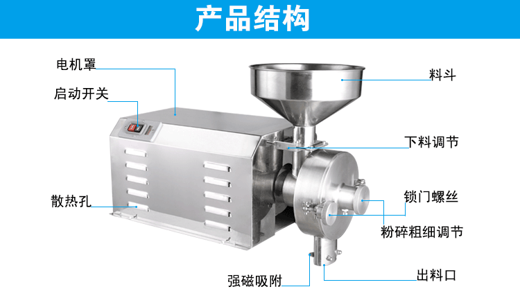 注意事项 1、磨粉机一定要外接断路保护(过载保护)装置,以保护电机和人身安全。 2、本机只能磨干性物料,物料越干,能磨越细。 3、380V磨粉机需请专业电工进行安装,确保磨粉机按照规定方向运转,方能确保磨粉效果。由于电源缺相导致电 4、220V磨粉机需请专业电工外接标准地线,才能避免电机罩和机头的静电。 5、磨粉机需固定在牢固稳定水平的桌面和柜台上,才能减轻震动和噪音。 6、未满18岁人员、超过65岁老人、弱智及动作迟缓者、未经学习培训、未仔细查看使用说明书的人员,一律不得 7、在加工过程中,如因停电等原因突然停机,必须清除粉碎腔内的残余物料后,才能再次启动。 8、如发现机器零件有严重磨损或损坏时应及时进行修理或更换。 9、机器启动后,应待运转正常时才能放料加工,注意进料量防止电机超载闷机。 10、每次用机结束后,应将机器内部清理干净,并通风晾干。 11、机器较长时间不用时,应切断外电源。机器勿到置,要平放,上面不要放重物。 12、本机保修一年,人为使用不当引起的损坏,以及正常磨损,不属保修范围。需返回销售单位或者厂家进行维修, 加工范围 1.各种粮食:芝麻、核桃、大米、黑米、黄豆、绿豆、红豆、花生、莲子、玉米、高粱、大麦、荞麦、燕麦等; 2.各种干性药材:淮山、杏仁、茯苓、红枣、芡实、枸杞、薏仁、山楂、淮山、首乌、红豆、阿胶、乳香、菟丝子、
