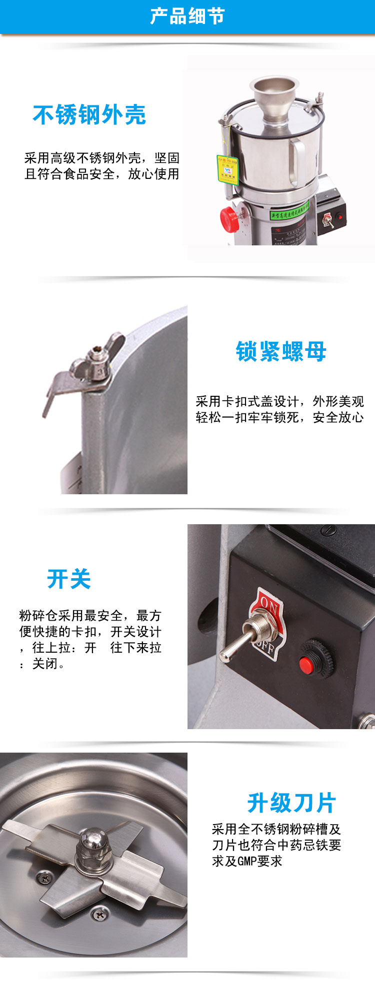 3、超细粉碎机采用不锈钢粉碎槽及刀片符合中药忌铁要求及GMP要求。