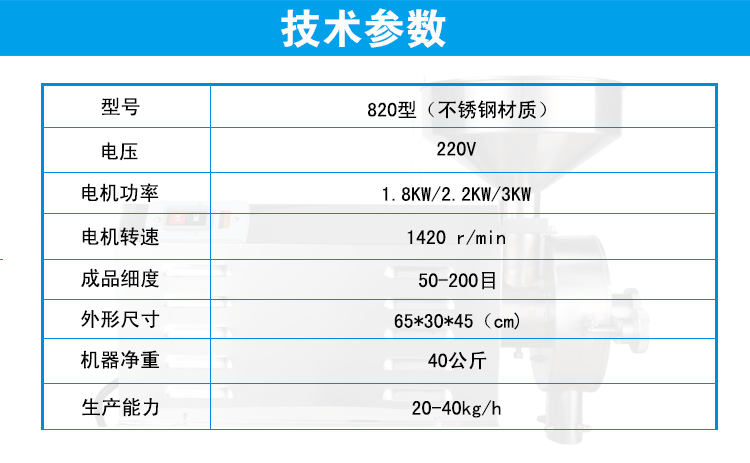 注意事项 1、磨粉机一定要外接断路保护(过载保护)装置,以保护电机和人身安全。 2、本机只能磨干性物料,物料越干,能磨越细。 3、380V磨粉机需请专业电工进行安装,确保磨粉机按照规定方向运转,方能确保磨粉效果。由于电源缺相导致电 4、220V磨粉机需请专业电工外接标准地线,才能避免电机罩和机头的静电。 5、磨粉机需固定在牢固稳定水平的桌面和柜台上,才能减轻震动和噪音。 6、未满18岁人员、超过65岁老人、弱智及动作迟缓者、未经学习培训、未仔细查看使用说明书的人员,一律不得 7、在加工过程中,如因停电等原因突然停机,必须清除粉碎腔内的残余物料后,才能再次启动。 8、如发现机器零件有严重磨损或损坏时应及时进行修理或更换。 9、机器启动后,应待运转正常时才能放料加工,注意进料量防止电机超载闷机。 10、每次用机结束后,应将机器内部清理干净,并通风晾干。 11、机器较长时间不用时,应切断外电源。机器勿到置,要平放,上面不要放重物。 12、本机保修一年,人为使用不当引起的损坏,以及正常磨损,不属保修范围。需返回销售单位或者厂家进行维修, 加工范围 1.各种粮食:芝麻、核桃、大米、黑米、黄豆、绿豆、红豆、花生、莲子、玉米、高粱、大麦、荞麦、燕麦等; 2.各种干性药材:淮山、杏仁、茯苓、红枣、芡实、枸杞、薏仁、山楂、淮山、首乌、红豆、阿胶、乳香、菟丝子、